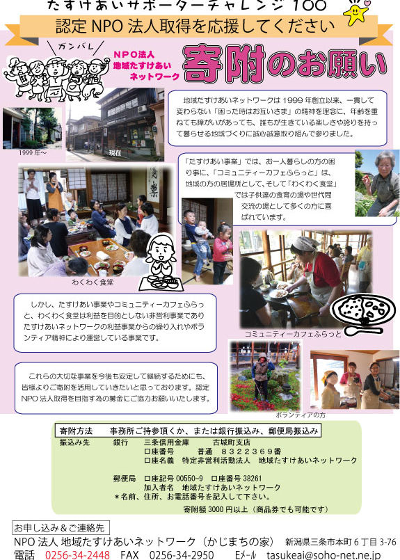 寄附は今後も受付いたします。地域たすけあいネットワークの活動へのご賛同とご協力をお願いしたいと思います。
